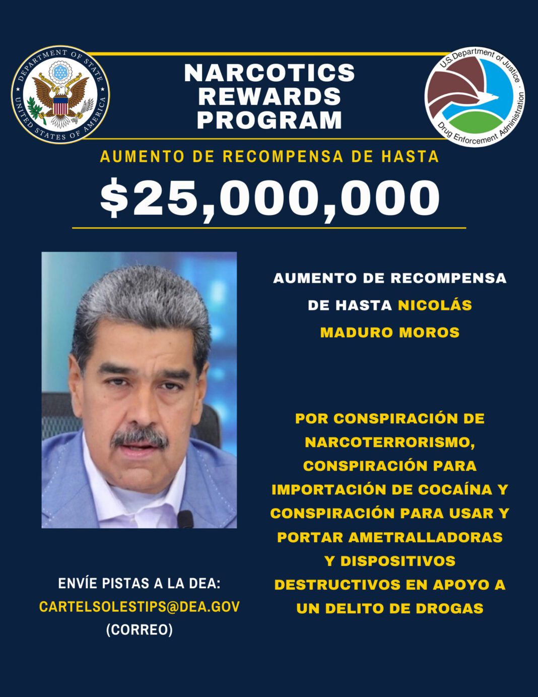 Además de la recompensa por Maduro, Estados Unidos ofrece 25 millones por información que lleve a la captura del ministro del Interior, Diosdado Cabello, y otros 15 millones por el arresto del ministro de Defensa, Vladimir Padrino.